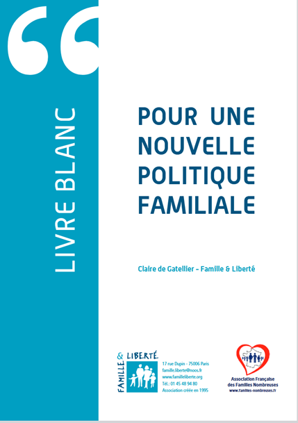 Famille et Liberté entend donner dans son Livre Blanc pour une Nouvelle Politique Familiale (2017) tout un arsenal de propositions concrètes étayées par une argumentation de fond pour montrer qu’il n’y a pas de justice sociale sans la notion toute familiale de ce qui est dû et demandé à chacun, dans le souci prioritaire du plus petit, mais en fonction de l’intérêt de la famille entière, par Claire de Gatellier, ancienne présidente de Famille et Liberté.